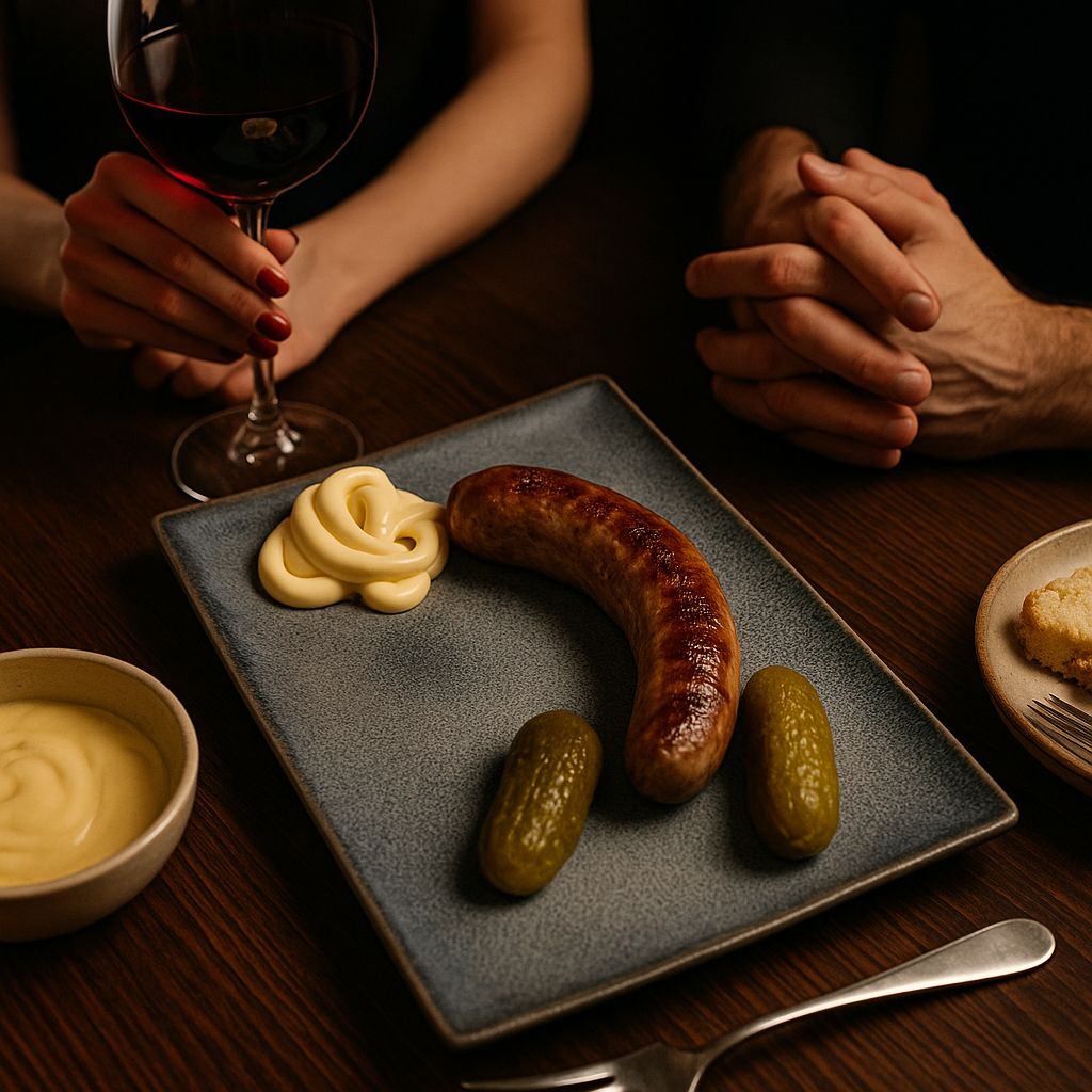 El intră în bucătăria ei și găsește farfuria pregătită: un cârnat bine rumenit, două bucăți de castraveți murați așezați într-un mod care nu lasă loc de interpretări nevinovate și o porție generoasă de maioneză poziționată strategic. Ridică o sprânceană și zâmbește. Ea, din cealaltă parte a mesei, îi răspunde cu o privire provocatoare și un citat: