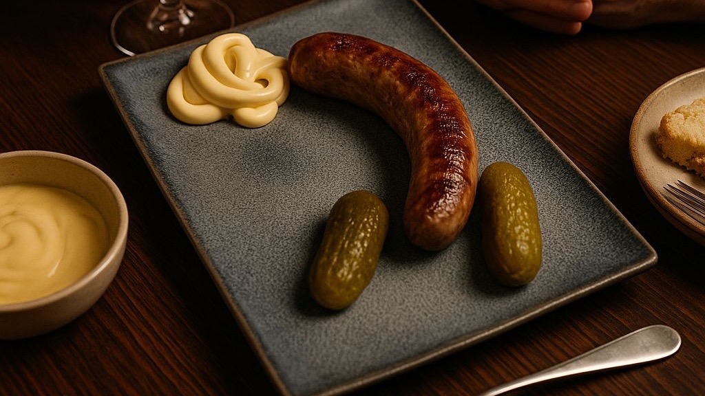 El intră în bucătăria ei și găsește farfuria pregătită: un cârnat bine rumenit, două bucăți de castraveți murați așezați într-un mod care nu lasă loc de interpretări nevinovate și o porție generoasă de maioneză poziționată strategic. Ridică o sprânceană și zâmbește. Ea, din cealaltă parte a mesei, îi răspunde cu o privire provocatoare și un citat:
