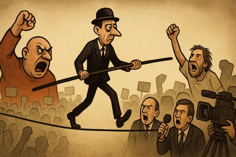 Dacă ar fi să rezumăm, echilibristica societății e sportul suprem al umanității: extremiștii urlă, șarlatanii mimează soluții, media amplifică, iar cetățenii dansează între absurd și indignare. Libertatea e folosită ca paravan, legea devine opțională, iar normalitatea e o glumă proastă.