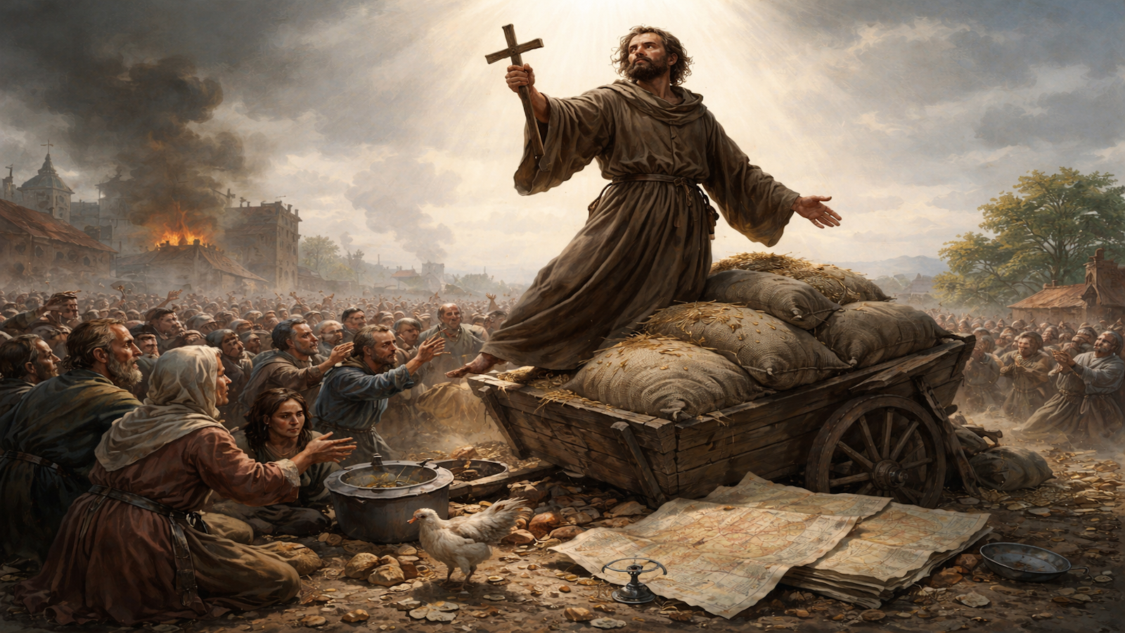 Pierre nu ridică o armată, ci o mulțime: iese în piețe și la marginea drumurilor, spune că i-a vorbit Dumnezeu, iar în câteva săptămâni îl urmează zeci de mii de oameni — țărani desculți, vagabonzi, femei cu copii în brațe — pe care îi împinge spre răsărit ca pe o turmă mutată dintr-un sat în altul, fără să le dea nici saci de grâne, nici căruțe, nici rute, nici ordine; în schimb le oferă o propoziție simplă, repetată obsesiv, că mâncarea va veni singură, iar pe drum rezultatul se vede imediat: hambare sparte, târguri jefuite, oameni care se bat pentru coji de pâine, sate care își baricadează porțile și o masă de flămânzi care se destramă în violență pe măsură ce înaintează, suficient cât să fie clar că aici nu funcționează o credință, ci un om care vorbește sigur despre ceva ce nu există și lasă realitatea să plătească pentru asta. Aceasta este „Cruciada țăranilor”. Rezultatul: foamete, jaf, violență, dezintegrare socială.