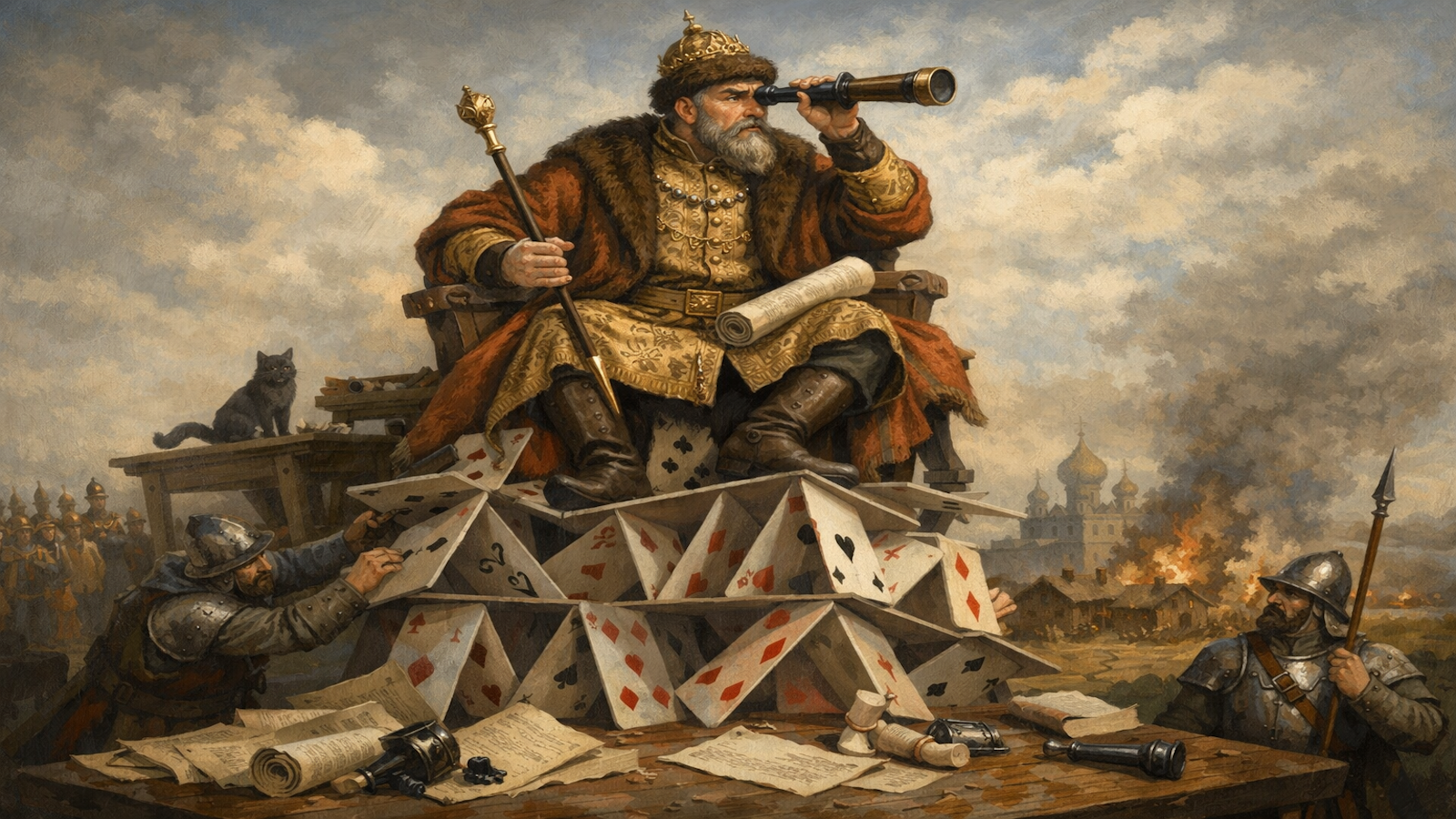 În episodul trecut al seriei Istoria minților rătăcite, rătăcirea se vedea în retragere și în blocaj, în ordine suspendate și decizii amânate până la paralizie; aici, din primul pas, rătăcirea se manifestă prin mișcare continuă: ordine date zilnic, pedepse aplicate demonstrativ, oameni luați din case și duși în piețe, orașe întregi tratate ca suspecte prin simpla voință a lui Ivan al IV-lea al Rusiei (1530 – 1584). Dacă în cazul Ioanei de Castilia controlul se dizolva în inacțiune, aici controlul devine obsesie practică: se confiscă, se mută, se execută, se rescrie realitatea prin decrete și alaiuri negre, iar frica nu mai este o stare interioară, ci un obiect vizibil, purtat pe străzi și lăsat intenționat la vedere. Nu e o reluare a aceleiași rătăciri sub alt chip, ci un mecanism diferit, care nu fuge de lume, ci o apasă metodic, pas cu pas, până când însăși ideea de ordine începe să semene cu o amenințare.