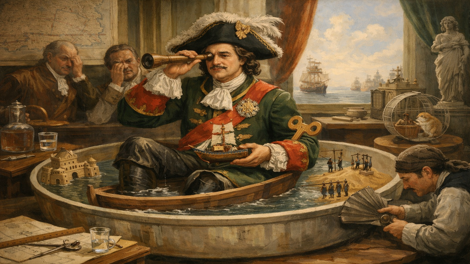 Petru cel Mare deschidea șantiere, trăgea linii pe planuri și împingea navele la apă zile la rând. În aceeași săptămână, bea până cădea, lovea slujitori și spargea mese în săli pline. Semna ordine dimineața și le anula seara, după o ceartă, cu o nouă listă de pedepse. Trimitea oameni la muncă forțată pentru greșeli mărunte și cerea dublarea pedepsei a doua zi. Își chema generalii la lucru continuu și îi izgonea noaptea, înjurând și aruncând obiecte. Când oboseala nu-l oprea, muta vinovații dintr-o celulă în alta, pentru siguranță. Ritmul se vedea pe fețe: planuri dimineața, lanțuri seara, fără pauză între ele.