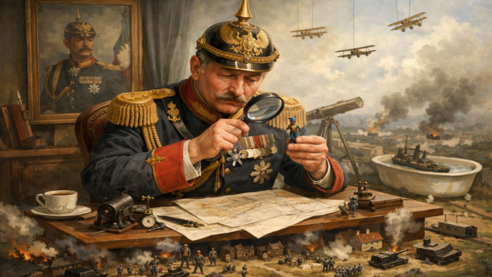 În 1890, Wilhelm al II-lea îl demite pe Bismarck, gest executat abrupt, fără plan de continuitate, din orgoliu personal. După această ruptură, schimbă miniștri frecvent, mutând oameni-cheie înainte ca deciziile lor să producă efecte măsurabile. În paralel, intervine direct în chestiuni militare, dă indicații strategice și corectează planuri elaborate de statul major. Contrastul e între afiș și teren: decizia politică se concentrează la vârf, competența rămâne mai jos, ignorată. Rezultatul observabil este blocajul administrativ, cu ordine suprapuse, corecturi târzii și un aparat de stat care funcționează în regim de improvizație.
