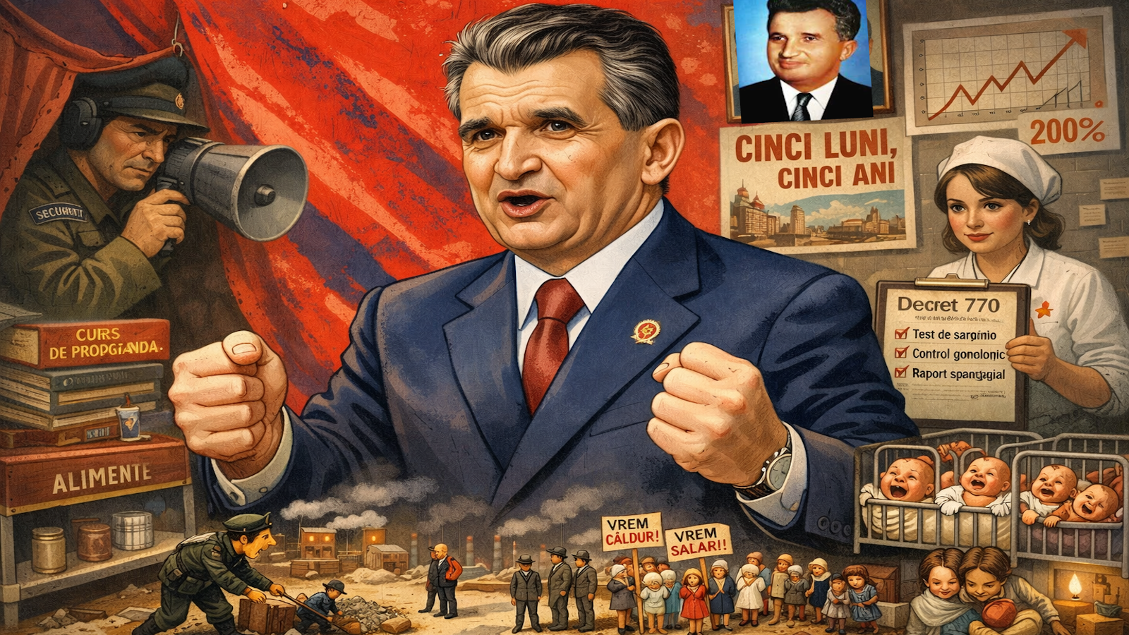 În 1982, Ceaușescu a găsit rețeta de „suveranitate” care te lasă fără lumină în casă: exportăm masiv aproape tot ce se poate exporta, ca să plătim datoria externă, iar populația învață rapid virtuțile foamei patriotice. A fost momentul în care economia n-a mai fost un instrument pentru trai, ci un instrument pentru ambiția personală: să bifezi „achitare integrală” ca pe o medalie, chiar dacă, între timp, țara funcționează pe avarie. Efectele au fost concrete, nu metaforice: penurii la alimente, restricții de energie, lipsuri de medicamente – adică viață redusă la minim, dar cu lozincă maximă. În logica asta, cetățeanul devine combustibil: îi tai consumul, îi tai speranța, îi tai viitorul, ca să arăți „în exterior” că ești tare. Nu era plan economic; era orgoliu contabil transformat în politică națională.